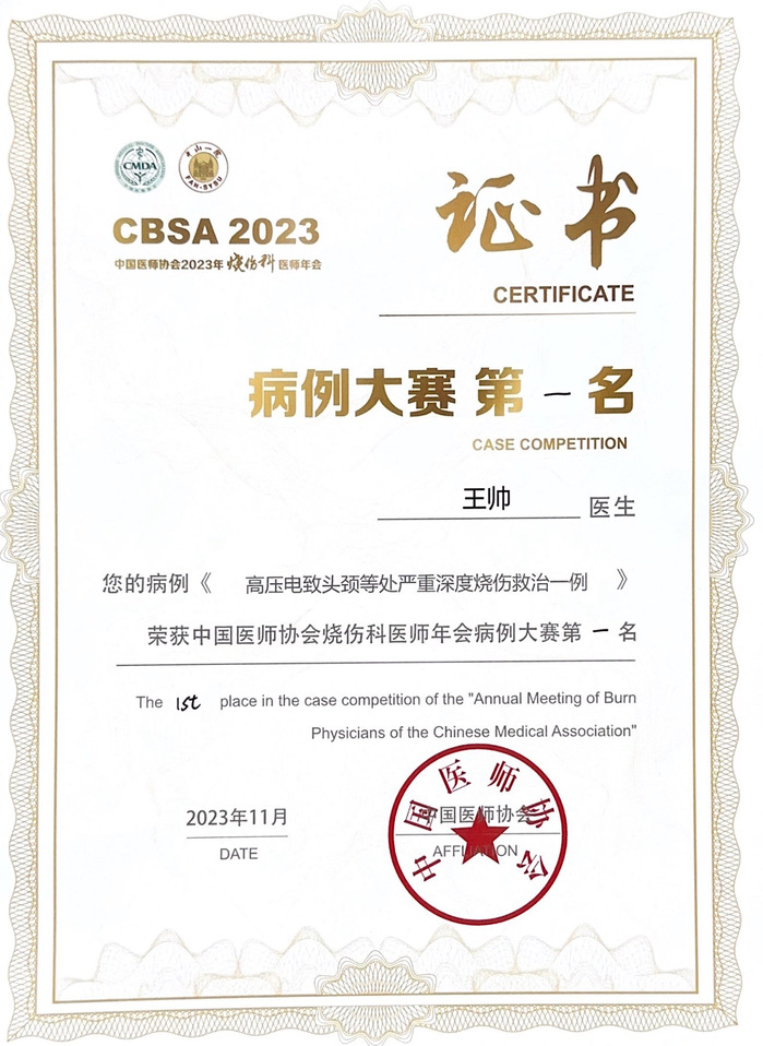 中国医师协会烧伤科病例大赛分为初赛和决赛两个环节,初赛通过前期专家线上评审的方式,共推选出50份代表性病例参加决赛;决赛分为现场病例汇报、病例答疑、评委评审等环节。经过激烈角逐,王帅汇报的病例《高压电致头颈等处严重深度烧伤救治一例》获第一名,充分展现了我校第一附属医院烧伤整形科医师精湛的技术水平和良好的精神风貌。