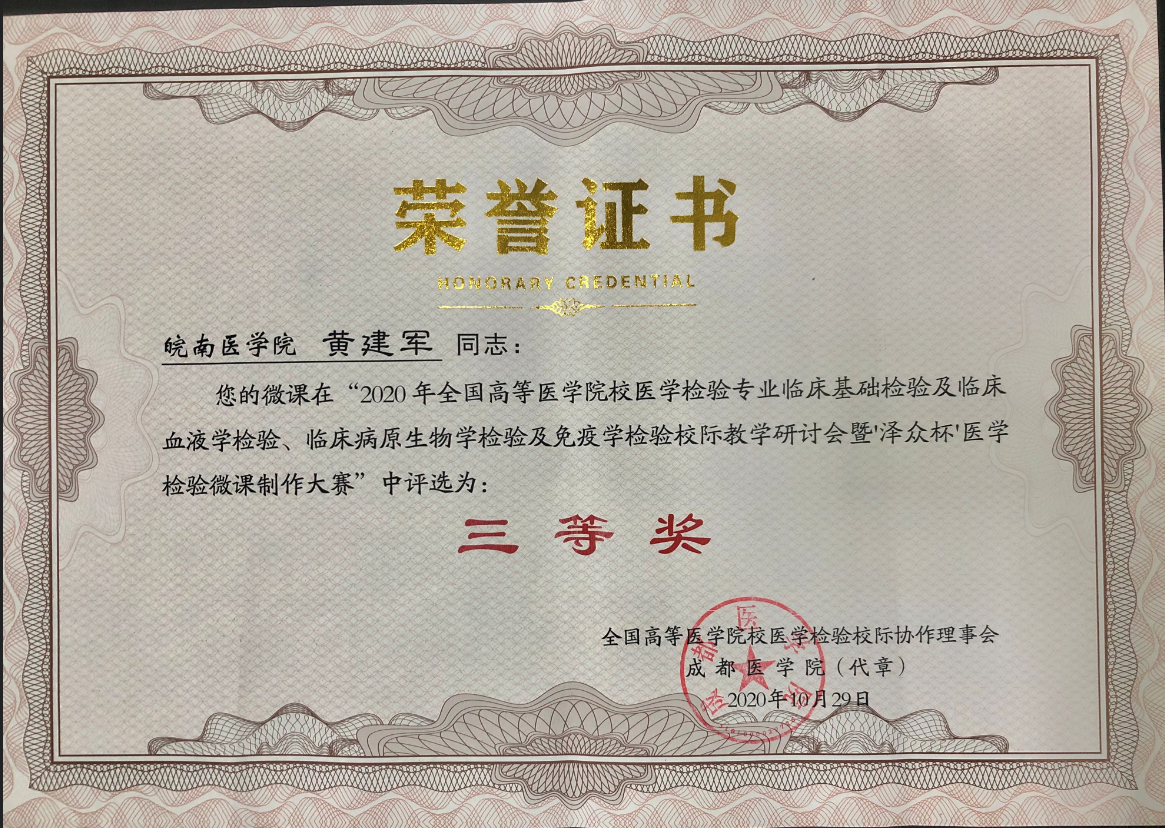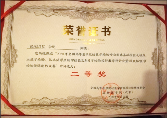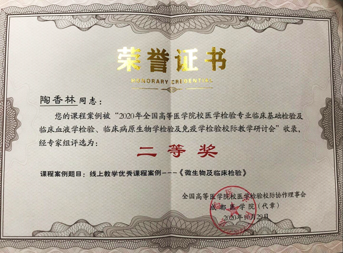 来自全国60多所高校的200余名代表参会。会议前半部分全国医学检验界的知名专家就国内疫情防控下以及新时代、新医科背景下,检验医学学科建设与教育改革、课程思政建设以及线上资源开发和利用等方面的热点、焦点问题分享了宝贵经验和思考。会议后半部分为线上优秀课程和微课制作竞赛,全国40多所医学院校的100多个作品参加了比赛。经过线上评选和专家评委会的现场评比,我校选送的三个作品均取得了优异的成绩,陶香林老师的线上教学优秀课程案例《微生物及临床检验》获竞赛二等奖,李婕、黄建军老师选送的作品《临床隐球菌检验》和《II型超敏反应的机制与检验》分别获得微课制作大赛二等奖和三等奖。会议期间,通过参会单位投票选举,我校还成功入选全国高等医学院校医学检验专业校际协作会临床病原生物学检验及免疫学检验专业学组常务理事单位。